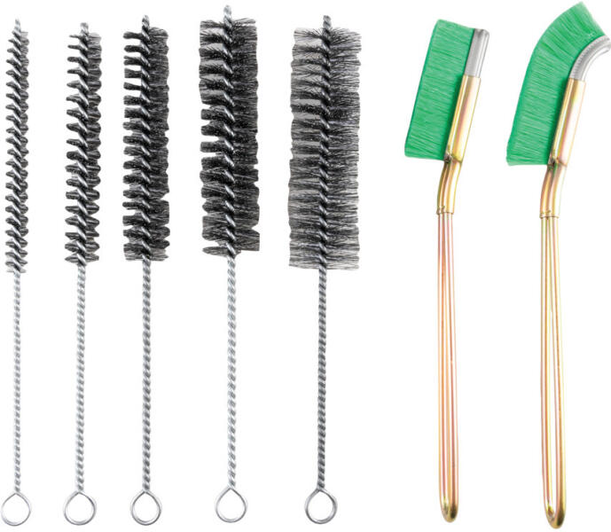 Csavart drótnyelű csőkefék - Kézi használathoz, 7 darabos készlet. Kézi használathoz Csavart drótnyél kézi használathoz Ipari karbantartáshoz mezőgazdasági felhasználásra műhelyekbe stb Csövek gerendák nehezen megközelíthető felületek ipari tisztításához 7 darabos készlet Összetétel mindenből egy darab Csőkefék 1x 10 15 20 25 és 30 mm átmérőben Nejlon tisztítókefék 1x hajlított és 1x egyenes