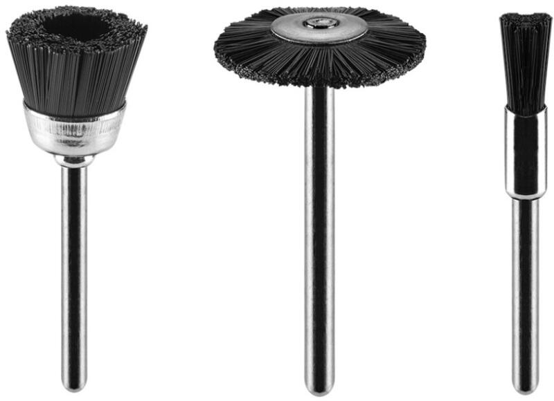 Nylon kefe GRAPHITE (cikkszám: 55H068) készlet 3 alakú kefe mini multifunkciós géphez: kefe (átmérő 5 mm), fazékkefe (átmérő 15 mm), a körkefe (átmérő 22 mm). Nejlonhuzalból készülnek. A keféket a szennyeződések eltávolítására, porszívózására, fényezésére és az elkészített felületek előkészítésére terveztékkényes anyagokból.
