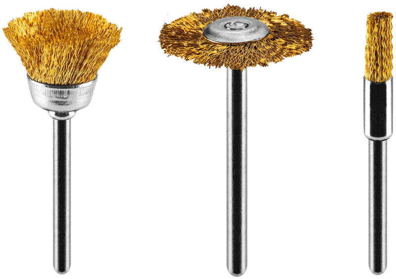 Sárgaréz drótkefe GRAPHITE (cikkszám: 55H067) készlet 3 alakú kefe mini multifunkciós géphez: kefe (átmérő 5 mm), fazékkefe (átmérő 15 mm), körkefe (átmérő 22 mm). Sárgaréz drótból készülnek. A keféket a szennyeződések eltávolítására, porszívózására, fényezésére és az elkészített felületek előkészítésére terveztékfából vagy fémből.