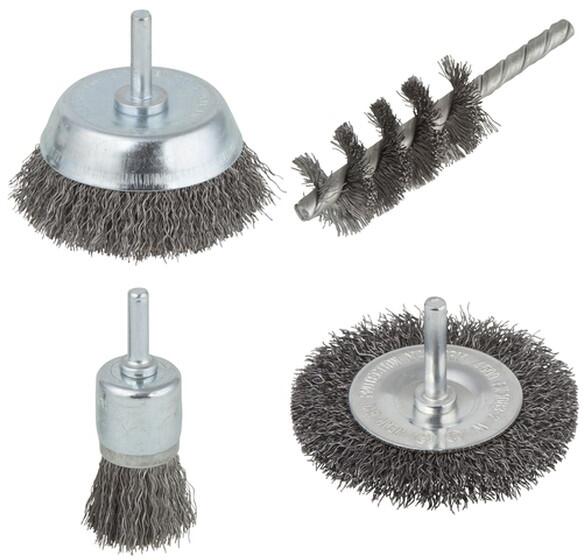 Készlet tartalma: 1 db drótkefe tárcsa, ø 75 x 10 mm, 1 db fazékkefe, ø 75 mm, 1 db hengertisztító kefe, ø 28 x 60 x 90 mm, ecset drótkefe, ø 25 mm szár: ø 6 mm.
